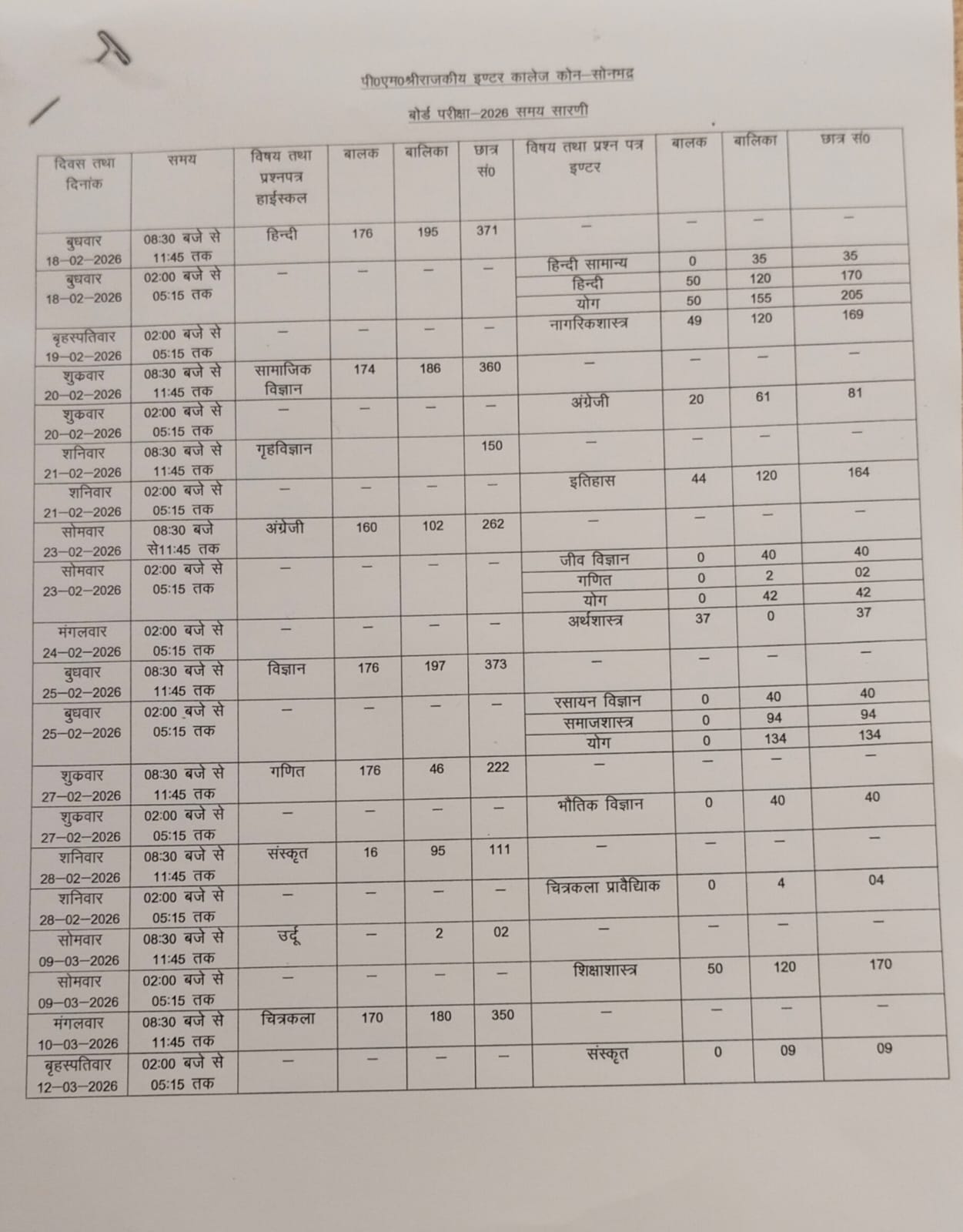 बोर्ड परीक्षा वर्ष-2026 समय - सारिणी